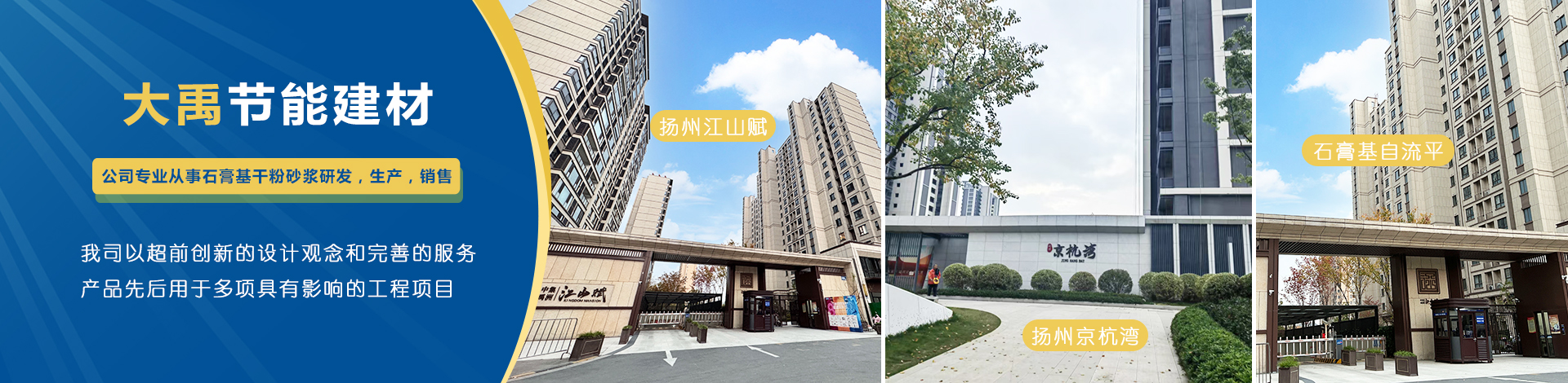 揚州市大禹節能建材科技有限公司成立于2005年9月,位于聯合國宜居城市---江蘇省揚州市,地處江都經濟開發區,與揚、鎮、泰三市接壤,交通十分便捷。公司是專業從事石膏基干粉砂漿研發,生產,銷售一體化的綜合性科技型企業,為國家標準GB/T2862-2012《抹灰石膏》的參編單位。  公司擁有國內一流的特種砂漿生產線,并配有各種先進的檢測儀器,年生產能力可達10萬噸。各崗位管理及技術人員齊備,對產品···